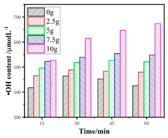 Hydroxyl radicals are generated from the oxidation of water, as shown in Equation (9). It is the core of electrocatalytic reaction. Hydroxyl radicals were measured by an indirect method with DMSO as the capture agent. HPLC was used to qualitatively determine the •OH content of 2.5D electrodes with different magnetic particle dosage. The variation of •OH content with electrolysis time is shown in Figure 2. The •OH content grew up improperly with the increase of Sb–SnO2 magnetic particle dosage and the extension of electrolysis time as shown in Figure 2. It meant that the •OH yield of the 2.5D electrode system was more than that of the traditional 2D electrode system. When the magnetic particle was 10 g, the •OH yield of the 2.5D electrode system was the highest. At 60min, the •OH yield of 2.5D electrode system was 673.4 µmol·L−1, while that of 2 D electrode system was 425.8 µmol·L−1.