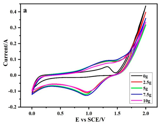 The cyclic voltammogram test was performed at an electrochemical workstation (CHI 660D, Chenhua, Shanghai, China) in a three-electrode cell system. Copper sheets acted as the counter electrode, and Ag/AgCl (sat KCl) served as a reference electrode. The measure of cyclic voltammogram test performed in 0.5 mol·L−1 Na2SO4 solutions at the scan rate of 0.05 V·s−1 from 0 V to 2 V.
