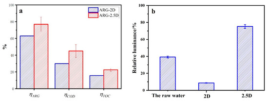 An electrocatalytic degradation experiment was carried out with ARG as the target. The results are shown in Figure 4 and Table 1. As shown in Figure 4a, the removal efficiency (including ηARG, ηCOD, and ηTOC) of the 2.5D electrode system is higher than that of the 2D electrode system. Meanwhile, the 2.5D electrode system has a higher CE, almost twice as much as the 2D electrode, with the current efficiency of 12.21% compared with 7.1%. The ECCOD decreases from 1.71 kWh/gCOD to 0.961 kWh/gCOD, as shown in Table 1. From the above results, one can find that the 2.5D electrode system has better performance in the electrocatalytic process than 2D electrode system. It may be because the 2.5D electrode system has a higher mass transfer coefficient, greater hydroxyl radical production, and more surface-active sites than the 2D electrode system.
