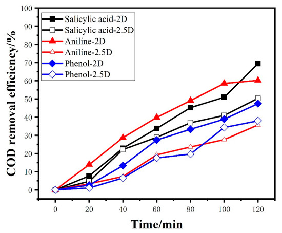 To further verify the superiority of the 2.5D electrode system in electrocatalytic capability, three other typical organic compounds (including Salicylic acid, Phenol, and Aniline) were used as degradation targets for electrocatalytic degradation experiments. The results are shown in Figure 5 and Table 1. The ηCOD-2 h and ηTOC-2 h of aniline were 60.18% and 56.01% by using the 2.5D electrode system, which were higher than 35.71% and 28.92% of the 2D electrode system. The CE of aniline for the 2.5D electrode system was 12.06%, higher than 10.05% for 2D electrode system. Meanwhile, the ECCOD decreased from 0.23 kWh/gCOD to 0.19 kWh/gCOD. Similar results could be obtained when the other two organics were degraded. All the above results show that the 2.5D electrode system has advantages in electrocatalytic capability over the 2D electrode system.