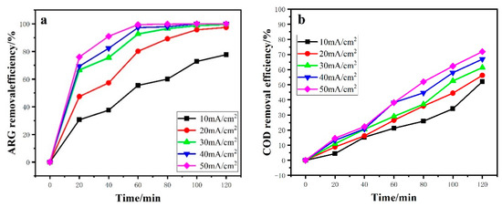 Effect of current density on ARG removal efficiency (a) and COD removal efficiency (b). Other operating conditions: ARG concentration of 100 ppm and temperature of 25 °C.