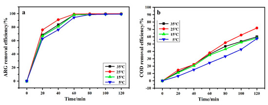 Effect of temperature on ARG removal efficiency (a) and COD removal efficiency (b). Other operating conditions: Current density of 50 mA/cm2 and ARG concentration of 100 ppm.