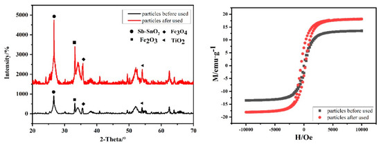 The XRD patterns, magnetization curves, and surface element content of the magnetic particles before and after 50 h-electrolysis are shown in Figure 9 and Table 3. As shown in Figure 9a, there were the diffraction peaks of Fe3O4 (35.51°), Fe2O3 (33.1°), TiO2 (62.8°), Sb–SnO2 (26.6° and 51.8°), which were consistent with previous researches. After the electrolysis for 50 h, there was no change in particle diffraction peak. It can be seen from Table 3 that, after electrolysis, the element content on the surface of particles changed slightly. Sn and Sb decreased, while Fe and Ti increased. It indicates that the surface of magnetic particles dissolved to a certain extent after electrolysis for 50 h, resulting in increased exposure of ferric oxide. As shown in Figure 9b, the magnetic properties of the particles increased after use. These results indicate that Sb–SnO2 magnetic particles had better stability than Sb–SnO2 electrodes. More importantly, this 2.5D electrode system provides excellent convenience for particle replacement and is conducive to the continuity of the electrocatalytic process improvement.
