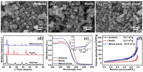 The SEM images (a–c), XRD patterns (d), UV–VIS DRS (e), Tauc plots (Inset) and N2 adsorption-desorption isotherms (f) of anatase, rutile, and mixed phase.