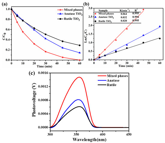 The photocatalytic performance of the three different crystal forms of TiO2 for ATL degradation, are shown in Figure 2. The De of mixed phase reached 100% within 60 min; while the ATL De was only 85.65% and 71.06% for anatase and rutile TiO2, respectively. As shown in Figure 2b, the rate constant of mixed phase TiO2 was almost 2–3-fold higher than that of anatase and rutile. In order to study the difference of charge separation of three kinds of TiO2, we supplemented the measurement of surface photovoltage spectroscopy (Figure 2c, SPS). SPS is a powerful tool to further characterize charge separation at the nanoscale [25]. The surface photovoltage (SPV) response in mixed phase is obviously higher than that of anatase and rutile, revealing a dramatic increase in charge separation efficiency. Therefore, the mixed phase exhibits the highest activity, possibly due to its large specific surface area and excellent charge separation efficiency, and the influence of light absorption may not be significant. It has previously been proven that electronic interaction easily occurs between anatase and rutile TiO2, with the electronic interaction between phases generating a mixed crystal lattice, causing the photocatalytic activity of the mixed crystalline nano-TiO2 to be generally higher than that of the single-phase nano-TiO2 [26].