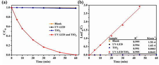 The photocatalytic degradation of ATL was compared under different experimental conditions, including UV-LED, mixed phase, combined UV-LED and mixed phase, and a control blank (Figure 3). Results demonstrated that ATL concentrations showed a negligible decreased in the absence of UV-LED and TiO2 photocatalyst or in the blank. ATL concentration decreased by 5% under conditions of TiO2 alone, which may be attributed to fluctuation in the adsorption-desorption equilibrium due to the large surface area (102.6 m2/g) of the TiO2 nano-powder. ATL was completely degraded by the synergistic effect of UV-LED and nano-TiO2 photocatalysts after light irradiation for 60 min. These results indicate that photo-induced charge carriers were generated on the TiO2 photocatalyst under UV-LED irradiation conditions. The photo-induced h+ then oxidized H2O molecules to generate the active hydroxyl radical species, and the active radicals h+ and OH can oxidize ATL into carbon dioxide, water molecules, and other non-toxic small molecules. The specific mechanism is outlined in Equations (1)–(3). Furthermore, the pseudo-first-order kinetics model (), was used to fit the obtained experimental data, showing a good fit for the photocatalytic degradation of ATL, while the R2 value (>0.99) in the Figure 3b indicated good linearity of the fitted plots. UV-LED combined with TiO2 displayed the highest k value of 0.0641 min−1, while the rate constant for the control group remained low.