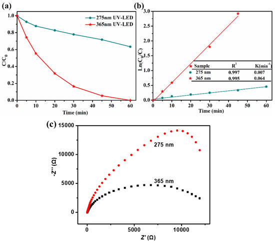 (a) Effect of varying UV-LED wavelengths on ATL degradation: C(ATL)0 = 18.77 µM; (b) Pseudo- first-order model of ATL degradation. (c) the EIS of mixed phase under UV-LED at a wavelength of 365 and 275 nm. C mixed phase) = 2.0 g/L; I0 = 774 µW/cm2; pH: 7.6; temperature: 20 °C.