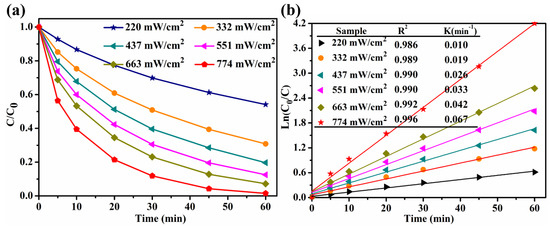 The UV-LED radiation intensity is an important parameter in the photocatalysis process, which directly determines the photon quantity in the photocatalytic system. The effect of varying light intensities (220, 332, 437, 551, 663, and 774 μW/cm2) on the De of ATL were investigated and as shown in Figure 5, the ATL De increased with an increase in light intensity. ATL was completely degraded within 60 min under an irradiation intensity of 774 μW/cm2, whereas only 57.23% of ATL was removed under a light intensity of 220 μW/cm2. As shown in Figure 5b, the ATL degradation rate constant increased from 0.010 min−1 to 0.067 min−1 as the UV-LED light intensity increased from 220 μW/cm2 to 774 μW/cm2, showing an almost seven-fold increase. The increase in light intensity essentially relates to an increase in photon flux per reaction volume, resulting in an increase in the number of activated TiO2 catalyst molecules per time unit. Consequently, electron transition in semiconductor TiO2 occurred effectively under strong light intensities, causing more holes and hydroxyl radicals to be produced and, therefore, enhancing ATL degradation under these conditions. In addition, ATL degradation showed a relatively strong linear relationship with the UV-LED radiation intensity.