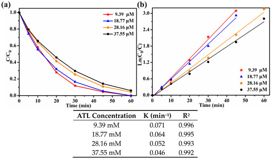 The influence of the initial target compound concentration on the degradation process was assessed, with four different ATL concentrations (9.39, 18.77, 28.16, 37.55 µM). As shown in Figure 6, the ATL degradation rate constant decreased from 0.071 min−1 to 0.046 min−1 when the initial concentration of ATL increased from 9.39 µM to 37.55 µM. This phenomenon occurs because the ATL molecules compete for the available hydroxyl radicals, with the insufficient availability of hydroxyl radicals causing the ATL degradation rate to decrease.