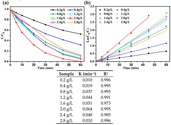 The influence of catalyst dosage on ATL degradation, was investigated by varying the initial photocatalyst mass concentration in the range of 0.2 g/L–2.8 g/L. The ATL degradation curve under different TiO2 dosages is shown in Figure 7. The photocatalytic degradation of ATL was only 47.64% in 60 min when the catalyst dosage was 0.2 g/L, and the ATL De gradually reached a peak level when the TiO2 dosage was increased to 2.0 g/L, achieving complete ATL degradation within 60 min. The ATL degradation efficiency then decreased with further increase in TiO2 dosage from 2.0 g/L to 2.8 g/L. These results indicate that the ATL degradation rate did not increase linearly in accordance with TiO2 concentration and that optimal ATL degradation at a rate constant of 0.064, was achieved at a TiO2 concentration of 2.0 g/L. This was mainly because ATL degradation was dominated by the concentration of effective hydroxyl radicals (OH) in the photocatalytic system. When the mass concentration of nano-TiO2 in solution was below the threshold of 2.0 g/L, more photoionization electron/hole pairs would be produced by increasing the TiO2 dosage and therefore, the concentration of effective hydroxyl radicals would increase. However, when the TiO2 dosage exceeds the threshold value of 2.0 g/L, UV light is scattered by an excess of TiO2 particles in solution, reducing the penetration of UV light through water. Consequently, the light utilization efficiency is greatly reduced, leading to a low ATL De.