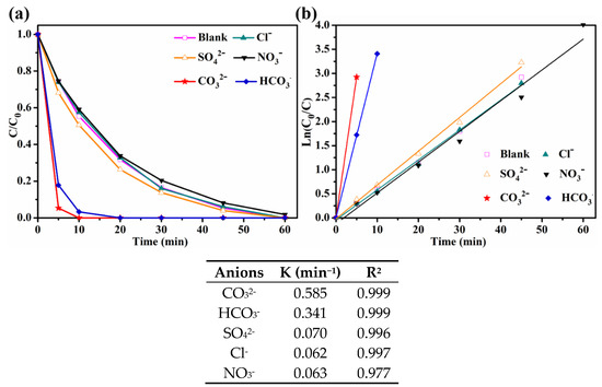 (a) Effect of co-existing anions in water on ATL degradation. (b) Pseudo- first-order model.
