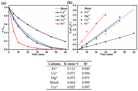(a) Effect of co-existing cations in water on ATL degradation. (b) Pseudo- first-order model.
