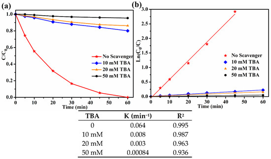 (a) Effect of free radical inhibition by varying concentrations of TBA on ATL degradation. (b) Pseudo- first-order model.