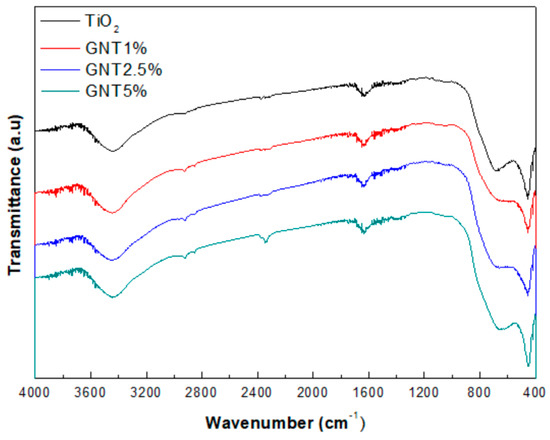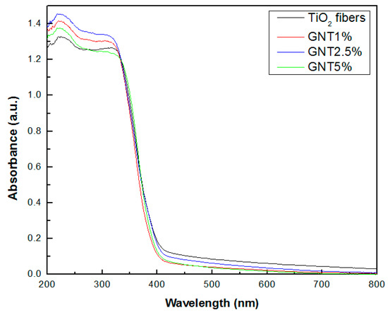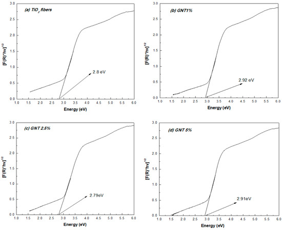 The optical properties of prepared composite catalysts were investigated by the UV-Vis diffuse reflection spectroscopy. Figure 6 displays the UV-Vis absorption spectra of fibrous materials and Figure 7 the determined energy band gaps (Eg) of each photocatalyst using the Kübelka–Münk function. The absorption edges of TiO2 fibers, GNT1%, GNT2.5% and GNT5% were determined at 442, 424, 444 and 426 nm, while the corresponding energy band gaps of TiO2 fibers, GNT1%, GNT2.5% and GNT5% were 2.8, 2.92, 2.8 and 2.91 eV, respectively. The presence of the red-shift in the reference TiO2 fibers could be attributed to residual carbon modification as revealed by FT-IR spectroscopy. The results indicate the improved response to visible light for all prepared fibrous catalysts.