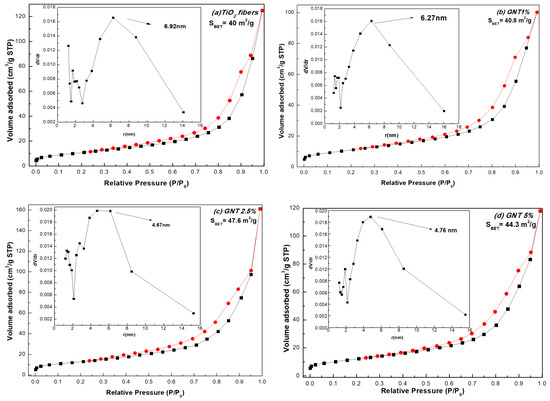 Nitrogen adsorption-desorption isotherms and pore size distributions for the prepared catalysts (a) TiO2, (b) GNT 1%, (c) GNT 2.5%, (d) GNT 5%.
