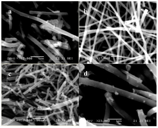 The structural features of all catalysts were also studied by SEM. The as spun fibers and the fibers after calcinations appeared in Figure S5 and Figure 4, respectively. The diameter of as spun fibers varied between 300–350 nm and between 200–350 nm for the calcinated ones. Moreover, in Figure S6 it is shown the structure of bulk g-C3N4 consisting of stacking sheets.