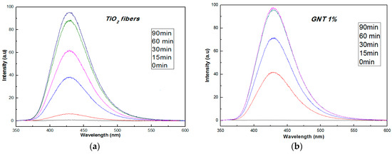 The photocatalytic ability of composite catalysts to generate •OH radicals was determined by fluorescence spectroscopy. The experimental results (Figure 8, Figure 9, Figure S8 and Table 2) showed that the kinetics of •OH radicals formation followed the trend kGNT 5% > kGNT 2.5% ≈ kGNT 1% > kTiO2 fibers which is consistent with the trend of the fibrous kinetics for the degradation of methylene blue. The photogeneration rate of •OH radicals for TiO2 fibers, GNT 1%, GNT 2.5% and GNT 5% were 0.288, 0.297, 0.298 and 0.348 μM min−1., respectively. As a result, the increase of g-C3N4 content in the composite fibers led to higher concentrations of generated •OH radicals.