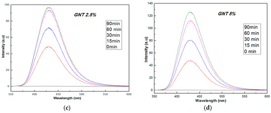 Fluorescence spectra of hydroxy-terephthalic (OHTA) formation of prepared fibers (a) TiO2, (b) GNT 1%, (c) GNT 2.5%, (d) GNT 5%.