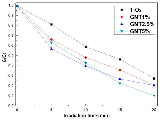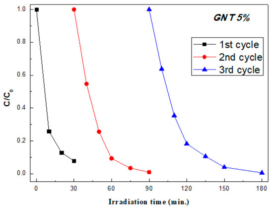 In order to investigate the recyclability of the prepared photocatalysts, the photocatalytic degradation of MB using the most efficient photocatalyst GNT 5% was studied for three consecutive cycles. According to the experimental results (Figure 11 and Table 3) the apparent reaction constants determined for the first, second and third catalytic cycle, were 0.0836 min−1, 0.0797 min−1 and 0.0736 min−1, respectively. A loss of 12% of its catalytic performance was recorded after the third cycle suggesting a good stability of the catalyst taking also into account some losses during the catalyst recovery process.