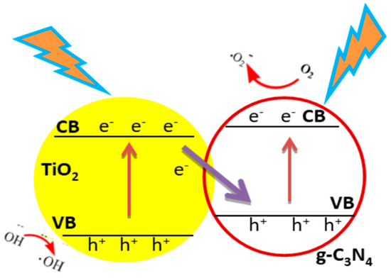 The conduction band (CB) and valence band (VB) potentials for g-C3N4 are −1.3 V and +1.4 V while the respective values for anatase TiO2 are −0.5 V and +2.7 V, respectively [24,25]. Considering firstly a type II heterojunction the excited electrons from the g-C3N4 CB will be transferred to the less negative TiO2 CB while the positive holes will be accumulated to the less positive VB of g-C3N4. However, taking into account the potentials for the oxidation for water (+2.34 V vs. NHE) or OH- (+1.99 V vs. NHE) to •OH radicals it can be concluded that g-C3N4 VB holes cannot oxidize water or OH- ions to produce •OH radicals. Hydroxy-terephthalic fluorescence measurements in the presence of g-C3N4 supported the above consideration revealing the low production of •OH radicals that can be attributed to the reductive pathway of O2 following the sequence O2•−, HO2•, H2O2. In addition, the composite fibers should present lower photocatalytic activity than the TiO2 fibers that was not the case [10,17,26]. As a result, type-II photocatalytic mechanism is not probable. On the contrary, the ability of the composite fibers to generation •OH radicals is much greater compared to that of g-C3N4 and higher than that of reference TiO2 suggesting a Z-scheme mechanism (Figure 12). In such mechanism, when the electrospun g-C3N4/TiO2 fibers are irradiated by the simulated solar light, the photo-generated holes (h+) were maintained in the VB of TiO2 and the excited electrons (e-) in the CB of TiO2 are combined with the holes in the VB of g-C3N4 while electrons are accumulated in the CB of g-C3N4 scavenged by oxygen. As a result, the generated holes in theVB of TiO2 have the suitable oxidation potential for the generation of •OH radicals while the trapping of e-(CBTiO2) by h+ (VBg-C3N4) induced a better charge separation, thus a higher photocatalytic efficiency.