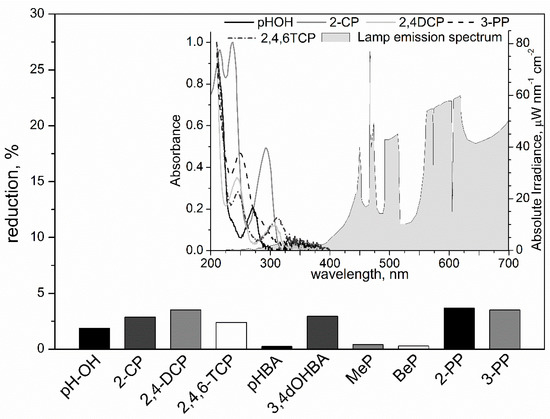 44], at the level of group III, i.e., acute toxicity. After the treatment, five compounds moved into a toxicity group. The degradation products of 2,4,6-TCP showed such low toxicity that after 120 min of photodegradation, the solution was classified as group I—no acute toxicity. The toxicity of the BeP solution after treatment decreased almost 10 times, and the solution changed from group IV to group III. This means that after 120 min of treatment, the BeP solution degradation products were acutely toxic. The same change was observed in the case of 3-PP. The 3-PP solution after phototreatment was still toxic. The MeP and 2,4-DCP solutions after treatment were classified as group II.