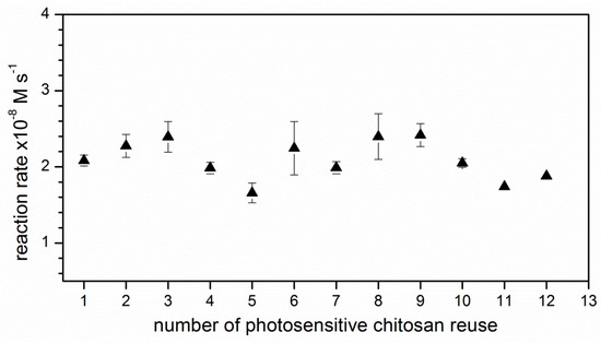 Figure 6, the photoactive chitosan exhibited superior photocatalytic activity after twelve photodegradation cycles, which clearly and significantly demonstrated the stability of the photocatalyst. The reaction rate of 2,4DCP degradation (as an example of a phenolic compound) slightly decreased during the 5th and 12th cycles, which may have been due to accumulation of intermediates on active surface sites of the photocatalyst. However, this decrease fell within the limits of measurement error. The obtained results proved that photoactive chitosan could be considered a reusable green catalyst that photo-degrades phenolic compounds in aqueous environments.