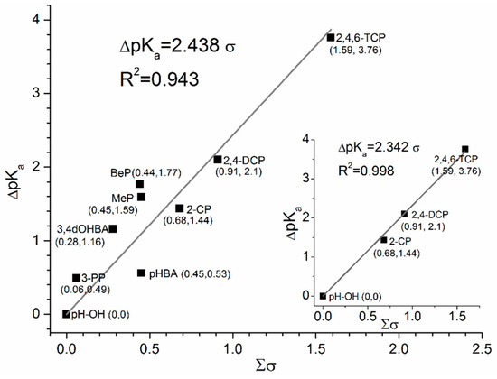 A good correlation was found between ∆pKa and substituent σ values (the correlation coefficient was R2 = 0.941). The highest reaction rate for 2,4,6-trichlorophenol and the lowest rate for phenol were observed. The slope of the correlation line provided a Hammett constant of ρ = 2.4, and the positive sign of the slope indicated that oxidation was accelerated for more substituted compounds than phenol.