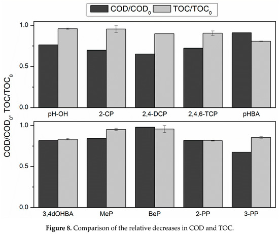 Figure 8. The TOC decrease indicated partial mineralization of the tested compounds. The best reduction in TOC (20%) was obtained for pHBA. A very similar TOC reduction was obtained for 3,4-dOHBA, a compound that differed from pHBA by the absence of one hydroxyl group. The reduction of TOC at the level of approximately 15% was also obtained for 2-PP and 3-PP. The loss of compounds in the tested solutions and the decrease in the TOC value indicated that the oxidation time was not long enough for further products to be released. As expected, the COD decrease was higher than relative reduction of TOC.