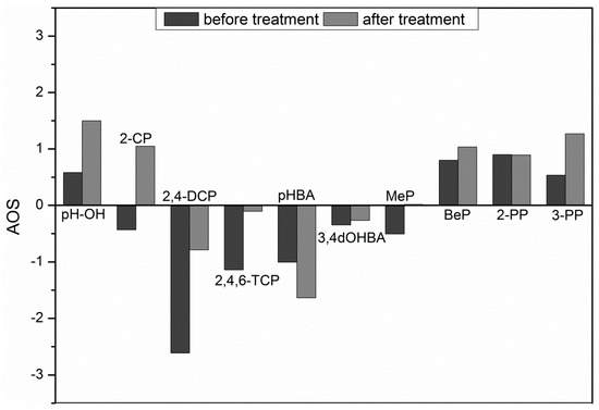 Despite the decreases in TOC and COD after the reaction, the results showed that not all of the degraded compounds were mineralized, or their biodegradability was not improved. The best biodegradability was achieved in the case of phenol and chlorophenols (the AOS value increased by more than 1). The AOS values of BeP, MeP, and 3-PP increased by 0.213, 0.514, and 0.732, respectively, meaning that the process improved the biodegradability of these photooxidation products. The AOS value also proved that the products of the oxidation process were more likely to be degradable than the parent compounds. Unfortunately, photosensitized oxidation did not change the biodegradability of some of 2-PP, which is very interesting because of its very similar structural formula to 3-PP. Moreover, the photodegradation of 2-PP in the reaction solution was better, possibly indicating that some products of the degradation of 2-PP were more resistant to photooxidation than the products of 3-PP degradation. Also, the AOS value for 3,4dOHBA after photosensitized oxidation improved (increased) very slightly, although its depletion in solution was quite fast. The reason of such poor AOS improvement was possibly the same reason as for 2-PP, i.e., that one of the products of 3,4dOHBA oxidation was hard to oxidize using singlet oxygen, or that the oxidant was more specific for some by-products in the reaction solution. In the case of pHBA, the AOS value decreased so it was probably that the by-products created during the process were more difficult to degrade than the parent compound.