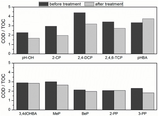 The obtained results of COD/TOC, for most of the tested solutions, were satisfactory and confirmed the increase in the degree of carbon oxidation during the treatment. Although the greatest decrease in the COD/TOC ratio was obtained for 2,4-DCP (more than 1), the values obtained for pH-OH, 2-CP and 2,4,6-TCP were also satisfactory (decreased by more than 0.6). The pHBA solution was similar to the AOS parameters, whereby the COD/TOC ratio indicated a reduction in the degree of carbon compounds oxidation. The most probable explanation for this would be that during purification, more complex compounds were formed than the parent compounds. In the case of 2-PP, the COD/TOC results, which were similar to the AOS values, showed that there was no change in the degree of carbon compounds oxidation during treatment of 2-PP, meaning that there was a really small improvement in biodegradability. The treatment appeared to improve biodegradability in all cases, except that of pHBA.