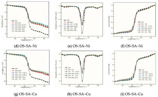 Figure 3 shows the TG, DTG, and conversion curves of the mixed pyrolysis of OS and SA-based catalysts. The pyrolysis of the supported transition metal salts and OS on SA considerably differed from that of OS. Figure 3a,d,g show that when OS and SA–Q were mixed and pyrolyzed, the total weight loss rate of the OS was less than the weight loss rate of the mixed pyrolysis of OS and SA. In addition, the initial pyrolysis temperature of the OS gradually decreased with increasing transition metal salt loading. This result may have been due to the fact that the supported transition metal salt reduced the activation energy required for OS pyrolysis, thereby allowing OS organics to pyrolyze in the low temperature range [27,28]. When the temperature increased, the volatile substances remaining in the pyrolysis system for a long time undergo a secondary reaction, which leads to an increase in carbon deposits and a consequent decrease in the weight loss rate. Figure 3b,e,h show that the maximum weight loss rate of OS–SA–Ni and OS–SA–Cu at different loadings was lower than that of OS–SA. However, the maximum weight loss rate was lower than OS–SA when ZnCl2 has the largest amount in OS–SA–Zn. In addition, when the transition metal salt loading was low, the temperature corresponding to the maximum weight loss rate did not change. When the transition metal salt loading was 3 wt%, the temperature of the maximum weight loss rate changed remarkably and was approximately 5 °C lower than the OS–SA pyrolysis temperature. The conversion curve Figure 3c,f,i show that at large transition metal salt loading, the conversion rate in the organic decomposition stage (300–520 °C) was high.