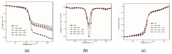 Figure 4 presents a graph of TG, DTG, and conversion of mixed pyrolysis of SA loaded with 3 wt% ZnCl2, NiCl2·6H2O, and CuCl2·2H2O with OS. The graphs of the samples with 3 wt% ZnCl2, NiCl2·6H2O, and CuCl2·2H2O were compared to study the effects of different transition metal salts loaded on SA on OS pyrolysis. The TG curve (Figure 4a) shows that the temperature of OS–SA–Zn at the same weight loss rate was lower than the other two other samples throughout the experiment. The mass loss demarcation temperature of OS–SA–Ni and OS–SA–Cu was 444.1 °C, prior to which the temperature required for OS–SA–Cu was low at the same weight loss rate. At temperatures higher than 444.1 °C, OS–SA–Ni was smaller than OS–SA–Cu at the same weight loss rate. In addition, OS–SA–Zn had the lowest total mass loss of pyrolysis, which was less than the total mass loss of OS–SA pyrolysis. Thus, ZnCl2, NiCl2·6H2O, and CuCl2·2H2O synergistically functioned with SA to promote OS pyrolysis, reduced the temperature required for pyrolysis, induced a secondary reaction of volatile products, and ultimately led to a decrease in total weight loss rate. This finding is consistent with previous analysis. The total weight loss rate of OS–SA–Zn was the smallest possibly because ZnCl2 started to volatilize rapidly at 450 °C and the OS interacted with ZnCl2, thereby decreasing the total weight loss rate of OS [13,29].