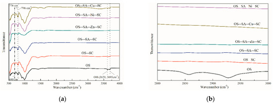 Figure 6 shows an ATR–FTIR diagram of OS and semi-coke, where Figure 6a presents the total in situ Fourier infrared spectrum, and Figure 6b illustrates the spectrum with a wavenumber between 3000 and 2800 cm−1. The overall trends were the same for OS and SC. The wavenumber showed a strong absorption band at 1100–900 cm−1, which is the absorption peak of silicate [33,34]. The medium intensity band near 690 cm−1 and the double band at 796 and 776 cm−1 were attributed to quartz and are characteristic absorption peaks of quartz, respectively [35]. The stretching vibration of hydroxyl (OH) in silicate kaolinite is between 3700 and 3500 cm−1, particularly at 3695 and 3620 cm−1 [36,37]. In addition, the spectrum of the semi-coke of OS–SA–Cu exhibited an absorption band at approximately 3400 cm−1, which was an absorption peak not found in the other spectra and may have been caused by water absorption of the sample in air [35,38].