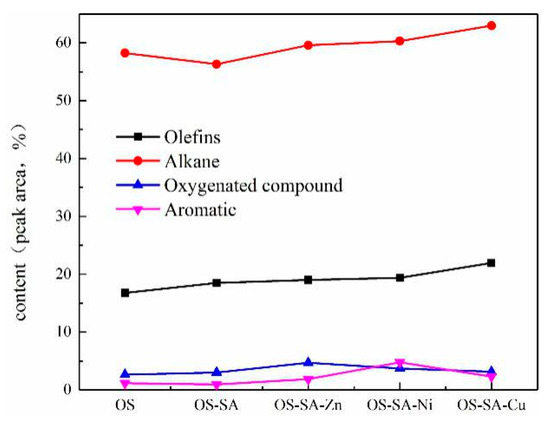 The area of the ion peak was used to provide relative content of the major class components to estimate the effect of SA and its supported transition metal salt catalyst on shale oil composition (Figure 8) [47]. The main components in shale oil were alkanes and alkenes in aliphatic hydrocarbons, accounting for more than 75% of the total mass, consistent with the analysis of major aliphatic hydrocarbons in shale oil and the results of Lai et al. [23]. Adding SA increased the olefin content and decreased the alkane contents compared with uncatalyzed pyrolysis of shale oil, leading to a small reduction in the total amount of aliphatic compounds. The gas phase cracking of the aliphatic compound during pyrolysis caused the aromatization of the hydrocarbon species and leds to a small increase in the contents of aromatics [16]. However, when the transition metal salt was supported on SA, the amounts of aromatic and aliphatic components in the shale oil increased. Hence, adding transition metal salt on SA decreased the pyrolysis temperature of the OS. During fixed bed pyrolysis experiments, the catalyst promoted the secondary reaction of volatile products with increasing temperature, thereby promoting the formation of hydrocarbons in the resulting oil, including aliphatic cracking, cracking of aromatic hydrocarbons and asphaltene side chains, and hydrogenolysis of hetero-carbon bonds of polar compounds [48,49]. For example, during cracking of an aliphatic group, the long chain alkyl group is cleaved to an olefin, and the short alkyl group can be further cracked or converted into an alkane by attracting a hydrogen atom.