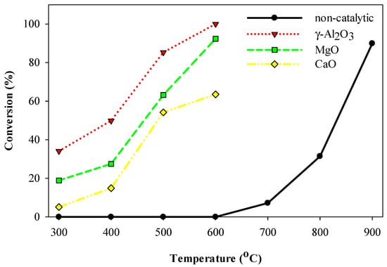 Figure 1 shows the effect of reaction temperature on the non-catalytic and catalytic conversion of HFC-134a over γ-Al2O3, MgO, and CaO. Owing to the thermal stability of HFC-134a [7], the thermal decomposition of HFC-134a was initiated at temperatures higher than 600 °C. The conversion efficiency of HFC-134a was gradually increased up to 89.9% by elevating the reaction temperature from 600 to 900 °C. Meanwhile, the catalytic conversion of HFC-134a over all catalysts was initiated even at the lowest temperature (300 °C) applied in this study. The conversion efficiencies of HFC-134a over all catalysts were increased by elevating the reaction temperature from 300 to 600 °C. Among the selected catalysts, γ-Al2O3 revealed the highest HFC-134a conversion efficiency at all temperatures, followed by MgO and CaO. At 600 °C, the catalytic conversion of HFC-134a over γ-Al2O3 achieved complete conversion and the conversion efficiencies of MgO and CaO were 92% and 64%, respectively.