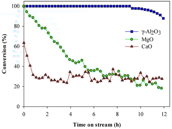 Figure 2 shows the time on stream HFC-134a conversion efficiencies over 12 h for γ-Al2O3, MgO, and CaO. Complete conversion of HFC-134a over γ-Al2O3 was maintained until 9 h of reaction, and the conversion efficiency gradually decreased to 88% after 12 h. Meanwhile, the conversion of HFC-134a over MgO was initially high, but rapidly decreased to 37% after 6 h of reaction. CaO revealed the lowest conversion efficiency, even at the initial reaction time, among the selected catalysts. It also showed a dramatic decrease of HFC-134a conversion efficiency compared to γ-Al2O3 and MgO. The conversion efficiency of HFC-134a over CaO rapidly decreased from 64% to 29% within 1 h and maintained a low HFC-134a conversion efficiency between 20 and 40% until the end of the test cycle (12 h). The above results indicate that the γ-Al2O3 displays not only higher conversion efficiency in the initial stage, but also longer lifetime during continuous reaction than those of other catalysts used in this study.