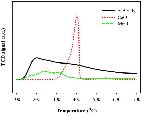 The higher conversion efficiency of HFC-134a on γ-Al2O3 compared to those on CaO and MgO can be explained by their respective specific surface areas and acidic properties. The BET surface area (SBET) of γ-Al2O3, 187 m2/g, was higher than that of MgO (144 m2/g) and much greater than that of CaO (3 m2/g). The higher surface area of catalyst can allow more chances for contact between reactants, thus allowing better mass transfer conditions of the reactants [14,15]. Another important key factor affecting conversion efficiency of HFC-134a was the acidic property of the catalyst. Figure 3 and Table 1 show the temperature-programmed desorption of ammonia (NH3-TPD) curves and the amount of weak, intermediate, and strong acid sites of fresh γ-Al2O3, MgO, and CaO, respectively. The amount of acid sites in the catalyst were classified to weak, intermediate, and strong acid sites based on the NH3-desorption temperature region; weak at below 250 °C, intermediate at between 250 and 400 °C, and strong at above 400 °C [16].