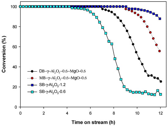 Although it could not achieve higher and longer decomposition efficiency than SB-γ-Al2O3-1.2, DB-γ-Al2O3-0.6-MgO-0.6 revealed the longer DT99 (6.9 h) than that of SB-γ-Al2O3-0.6. This suggests that the additional use of MgO can provide a higher conversion efficiency of HFC-134a, as can be expected with the result in Figure 2. When we compare SB-γ-Al2O3-1.2 and MB-γ-Al2O3-0.6-MgO-0.6, 0.6 g of MgO substituted 0.6 g of γ-Al2O3 with similar DT99. In case of SB-γ-Al2O3-0.6 and MB-γ-Al2O3-0.6-MgO-0.6, DT99 increased 1.6 times with addition of 0.6g MgO. Since the price of γ-Al2O3 is much higher than that of MgO, additional use of MgO with γ-Al2O3 will highly reduce the cost of catalysts. Interestingly, MB-γ-Al2O3-0.6-MgO-0.6 led the longer DT99 (8.8 h) than DB-γ-Al2O3-0.6-MgO-0.6 (6.9 h) on the decomposition of HFC-134a. This suggests that the lifetime of γ-Al2O3, MgO, or both of those catalysts can be extended by the use of mixed γ-Al2O3 and MgO.