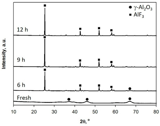 The role of MgO was identified by the comparison XRD of spent catalysts in the presence or absence of MgO. In our result, the diffraction lines of fresh γ-Al2O3 and spent catalysts collected after the specific reaction times (6, 9, 12 h) were different. In the absence of MgO, γ-Al2O3 was converted into AlF3 from the sample collected after the 6 h of reaction. This coincides with the decrease in catalytic conversion efficiency of HFC-134a over SB-γ-Al2O3-0.6 (Figure 5). The diffraction line corresponding to AlF3 also increased with the increase of reaction time. This also confirms that the decrease of HFC-134a conversion efficiency is caused by the conversion of γ-Al2O3 to AlF3. The formation of AlF3 on the catalytic decomposition of HFC-134a is related with the gas-solid reaction of γ-Al2O3 with HF, which can be expressed as following Equation (1) [18]: