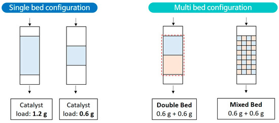 γ-Alumina (γ-Al2O3, Alfa Aesar, Haverhill, MA, USA), MgO (Daejung Chemicals and Metals Co., Ltd., Siheung, South Korea) and CaO (Junsei Chemicals Co., Ltd., Tokyo, Japan) were used as the catalysts for the catalytic decomposition of HFC-134a in this study. The catalysts were crushed, sieved to make their average particle size of 1.0–1.7 mm, calcined at 650 °C for four hours, and stored in a desiccator before use. In order to analyze the effect of each catalyst on the catalytic conversion of HFC-134a, 1.2 g of each catalyst was prepared as a single bed catalyst, respectively. To investigate the synergistic effect of different catalysts, double catalyst bed and mixed bed were prepared as shown in Figure 7. The double bed consisted of two catalyst layers, an upper bed with γ-Al2O3 (0.6 g) and a lower bed with MgO (0.6 g), and identified as “DB-γ-Al2O3-0.6-MgO-0.6”. The mixed bed was prepared by dry mixing of 0.6 g of MgO and 0.6 g of γ-Al2O3. The catalyst performance of double bed and mixed bed were also evaluated by comparing their HFC-134a conversion efficiency with those of single γ-Al2O3 beds (0.6 or 1.2 g).
