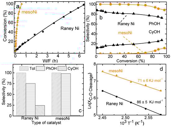 The conversion of BPE on ordered mesoporous Ni as a function of space time (W/F) is compared with Raney Ni in Figure 2a. For Raney Ni with large particle size, the conversion of BPE achieved 96% at a high space time of 6.5 h. The mesoNi showed much higher conversion (>99% in 0.9 h) compared to Raney Ni. This result suggests that the mesoNi catalyst was more active than non-porous Raney Ni for hydrogenolysis of BPE [31]. Figure 2b shows the major product distribution as a function of hydrogenolysis conversion of BPE on mesoNi and Raney Ni. Consistent with previous work, phenol (PhOH) and toluene (Tol) are the primary products of hydrogenolysis over all catalysts. These products could then be hydrogenated to cyclohexanol (CyOH) and methylcyclohexane (MCH) (Scheme S1). From Figure 2b, mesoNi showed much higher selectivity for PhOH. CyOH was only generated when mesoNi was used under a high conversion level above 20%, which indicated the selectivity of these reactions was strongly dependent on the porous structures of Ni-based catalysts. From the selectivity to primary products at certain low conversion level of 20% ± 2% (Figure 2c), mesoNi gave the higher yield of PhOH compared to Raney Ni, which also meant a higher hydrogenolysis efficiency for BPE. Changing the catalyst structure from mesoporous to non-porous led to a significant decrease in the selectivity toward C–O hydrogenolysis. The apparent activation energy (Ea,app) of liquid phase hydrogenolysis of BPE for non-porous Raney Ni and mesoNi is shown in Figure 2d. The mesoNi showed the lowest Ea,app of 71 KJ/mol. The apparent activation energy of phenol hydrogenation to cyclohexanol was higher than that of hydrogenolysis of BPE (89 KJ/mol compared to 71 KJ/mol, Figure S3), which indicated the elevated temperature was beneficial to increase the selectivity of cyclohexanol [32].