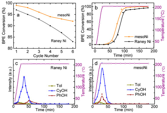 In order to study the regeneration processes and stability of the mesoNi and Raney Ni catalysts, the reusage activities of hydrogenolysis of BPE with these catalysts was examined in batch at 120 °C for six runs. As Figure 3a displays, BPE conversion of all catalysts decreased with increasing recycling batch runs. For mesoNi, BPE conversion decreased about 7% after six runs, which demonstrates the mesoNi had higher recycling abilities and stabilities than non-porous Raney Ni. From ICP analysis of the products solution, no detectable amount of Ni leached out of the catalyst during the reactions (Table 1). For the hydrogenolysis of BPE, poisoning and fouling of the Ni-based catalysts could be the main reason for the deactivation during the reaction process [22,23]. Hence, metal leaching is not the main reason for catalyst deactivation and quite limited Ni concentration (<0.1 mg·L−1) was detected in the reaction products. To further study the regeneration mechanism, the deactivated catalysts were washed with pure isopropanol to remove the residual products and then regenerated at 205 °C with 5.0 mmol L−1 BPE in isopropanol as the H-donor (Figure 3b). The BPE conversion remained quite low when the regeneration temperature increased to 205 °C. Then the BPE conversion gradually increased and reached the highest value (91.4% and 96.7%) with 105 and 89 min for Raney Ni and mesoNi, respectively. The deactivation and regeneration of Ni-based catalysts are often associated with the surface adsorption of the organic intermediates and products [33], and these surface adsorbed species have different poisoning effect to the deactivation of the catalysts, which is vital to further investigate the deactivation and regeneration mechanism [34,35].