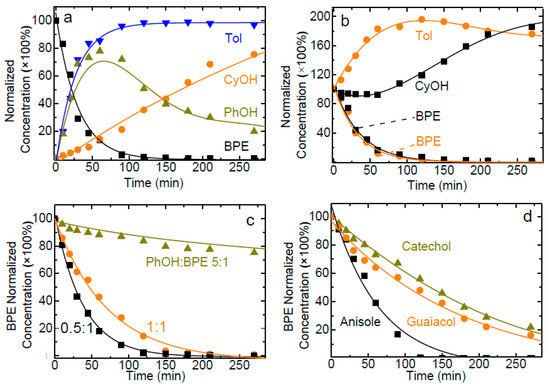 To further investigate the competitive reaction pathways during the reaction processes, hydrogenolysis of BPE were carried out in a mixture with reaction products or analogous phenolic monomers at 120 °C (Figure 4a) [35,38]. From Figure 4a, the conversion of BPE hydrogenolysis achieved 71% after 30 min. However, the conversion of BPE hydrogenolysis progressively varied in the presence of toluene (60%), cyclohexanol (56%), and phenol (24%) after 30 min (Figure 4b). Therefore, the addition of PhOH obviously decreased the BPE conversion compared to Tol and CyOH. Moreover, the hydrogenation rate for PhOH was much faster than that of Tol, which indicated the higher reactivity and lower active energy of PhOH hydrogenation. When equimolar phenol was added to the BPE solution, competitive adsorption could have happened between the added phenol and the phenol generated from the hydrogenolysis of BPE (Figure 4c) [39]. Hence, the hydrogenolysis rate of BPE could be influenced at last [20,40]. However, when the phenol was added to the reaction system, the hydrogenolysis rate of BPE greatly decreased. The hydrogenation rate of phenol was higher than that of toluene since almost no methylcyclohexane was generated during the reaction. Hence, hydrogenolysis of BPE was greatly influenced with the addition of phenol. Compared to Figure 4c, the effects of other phenolic monomers formed in lignin disassembly were also analyzed by addition of equimolar catechol, guaiacol, and anisole to the BPE during the hydrogenolysis reactions (Figure 4d). The hydrogenolysis rate of BPE was the most affected by the addition of catechol and anisole showed the least hinderance effect analyzed from kinetic profiles [41]. These results analyzed together with those relative to chemical species generated in the reaction, implied that the hydrogenolysis process of BPE was very sensitive to the presence of analogous phenolic monomers in the reaction system.