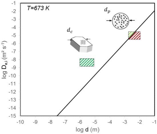 Internal mass transfer limitations assessed by the Weisz–Prater criterion (Equation (1)) in an industrial ethanol dehydration reactor as a function of particle diameter d, which can correspond either to the crystallite diameter, i.e., dc, or to the pellet diameter, i.e., dp, and the effective diffusion coefficient De,i. The black line indicates the criterion limit of 0.08. Boxes indicate the typical ranges of diffusion coefficient and diameter for either crystallite or pellet. (Green: no internal mass transport limitations; red: internal mass transport limitations).