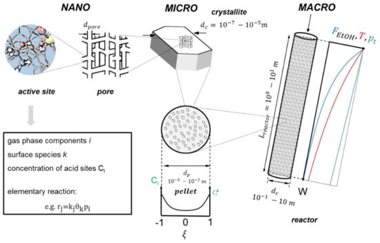 The most extensively investigated catalyst for ethanol dehydration is H-ZSM-5, which is composed of pentasil units. It consists of elliptical straight channels (0.53 nm × 0.56 nm) and near-circular sinusoidal channels (0.51 nm × 0.55 nm) that perpendicularly intersect []. This pore network is located in small crystallites with a diameter (dc) ranging between 10−7 and 10−5 m. These crystallites are typically embedded in a binder when applied industrially, to increase the mechanical strength and allow the formation of larger pellets (dp = 10−3 − 10−2 m), so to limit the pressure drop over the catalyst bed. Therefore, two different length scales for internal mass transport limitations exist. An assessment of the relative importance of these limitations can be made using the Weisz–Prater criterion []: