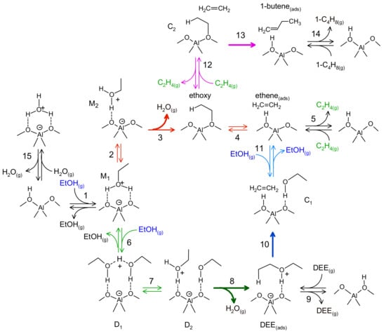 Reaction network used for the simulation of the industrial reactor (red: monomolecular dehydration, green: bimolecular dehydration, blue: di-ethyl ether decomposition, magenta: ethene dimerization). Modified from Alexopoulos et al. [].