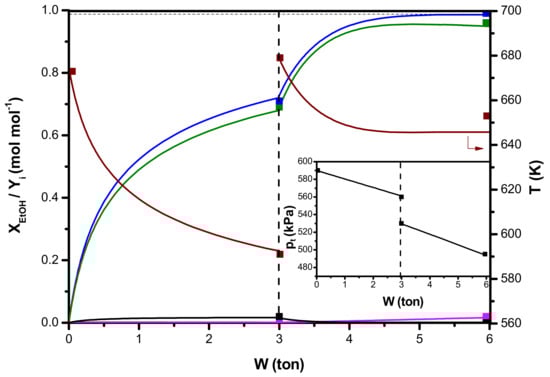 Ethanol conversion (), ethene, di-ethyl ether, and butene yield (green: ), and temperature profiles (T) as a function of catalyst mass. The inset shows the pressure drop (pt) as a function of catalyst mass. Calculations were made by integration of Equations (5)–(7) and (12) and simultaneously solving Equations (26) and (28) with the corresponding net production rates as defined in Equation (27), with parameters taken from Table 2 and the experimental conditions given in Table 3. Square symbols indicate the experimental points from [] given in Table 4.