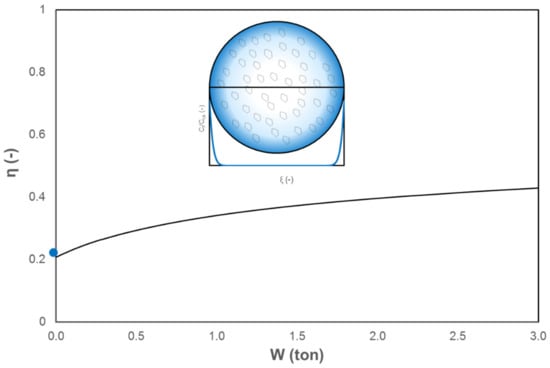 Catalyst effectiveness factor, calculated by Equation (21), as a function of catalyst mass. The inset shows the relative concentration profile along the dimensionless catalyst pellet diameter. Calculations were made by integration of Equations (5)–(7) and (12) and simultaneously solving Equations (26) and (28) with the corresponding net production rates as defined in Equation (27), with parameters taken from Table 2 and the experimental conditions given in Table 3.