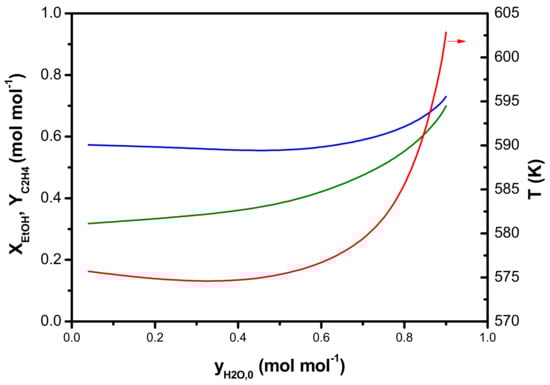 As good agreement was achieved between the model and the reported values, the model was considered to provide reliable predictions and, hence, was used to investigate and optimize an industrial ethanol dehydration reactor. Key process parameters for industrial operation are the amount of water added to the feed and the operating temperature. The thermodynamic equilibrium composition as a function of temperature was investigated by minimization of the Gibbs free energy. Three cases were considered: