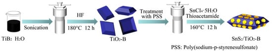 The preparation route of SnS2/TiO2-B is illustrated in Figure 1. A certain amount of HF aqueous solution is mixed with the sonicated TiB2 suspension. Then a hydrothermal reaction of the mixture is conducted in a 100 mL Teflon-lined autoclave at 180 °C for 12 h. After the reaction, the dark blue Ti3+ defective TiO2 (TiO2-B) is obtained. Then TiO2-B is mixed with an aqueous solution of Poly (sodium 4-styrenesulfonate) (PSS) for 20 min. The treated TiO2-B is then dispersed in deionized water in a 100 mL Teflon tube. After adding an appropriate amount of SnCI4·5H2O, thioacetamide (TAA) and acetic acid, the hydrothermal reaction is performed at 160 °C for 12 h. Finally, a heterojunction photocatalyst SnS2/TiO2-B is obtained.